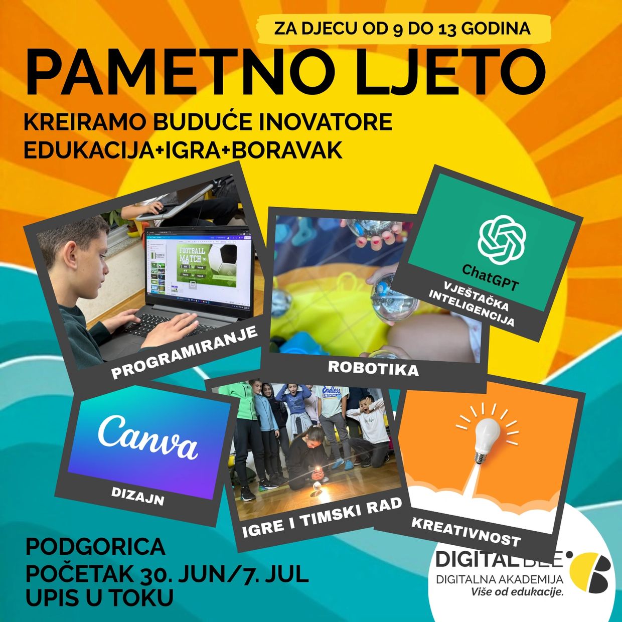 Naš ljetnji edukativni program prilagođen je djeci uzrasta od 9 do 13 godina koja žele da istraže svijet tehnologije, kreativnosti i timskog rada.